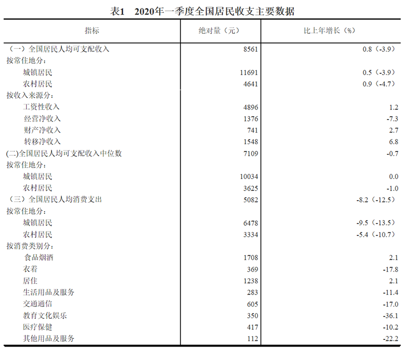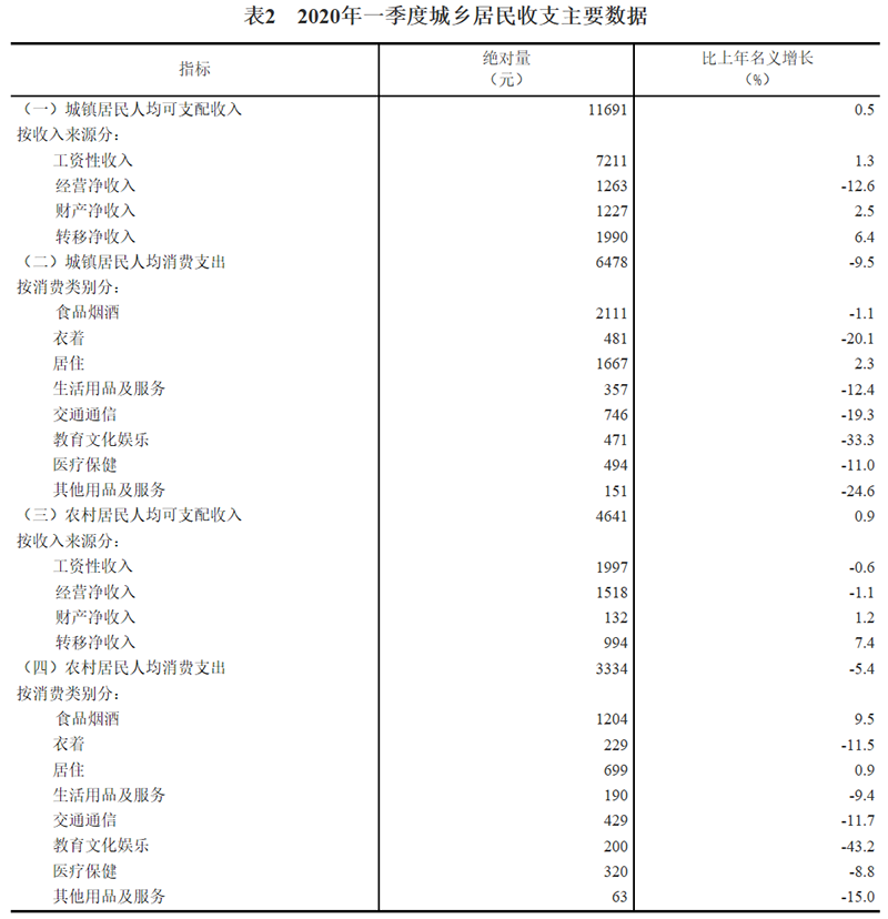2020年一季度居民收入和消费支出情况
