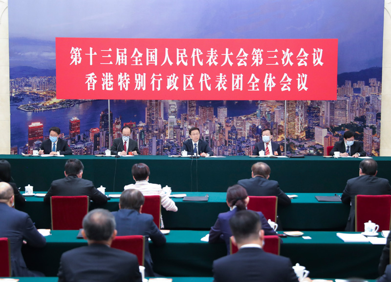 韩正分别参加了香港代表团、澳门代表团审议。韩正与香港、澳门地区全国人大代表进行了亲切交流。韩正表示,过去一年多来,在中央的大力支持下,在特区行政长官和特区政府的带领下,香港、澳门积极应对各种困难和挑战,推动经济社会发展和改善民生,特别是新冠肺炎疫情发生后,特区政府快速反应,有效控制疫情蔓延,取得的成绩值得充分肯定。“修例风波”以来,“港独”、“黑暴”破坏香港经济社会发展,冲击“一国两制”底线,已成为香港社会的公害。从国家层面建立健全香港特别行政区维护国家安全的法律制度和执行机制,是中央在维护国家安全方面应当行使的权力和应当履行的责任,针对的是搞“港独”、“黑暴”等的极少数人。依法有效防范、制止和惩治危害国家安全的极少数违法犯罪行为,是为了更好地保障香港绝大多数居民的生命财产安全,更好地保障基本权利和自由,维护香港的长治久安和繁荣稳定。全国人大有关决定以及全国人大常委会下一步有关立法,与香港基本法第23条的规定是并行不悖、相辅相成的。中央坚定不移、全面准确贯彻“一国两制”、“港人治港”、“澳人治澳”、高度自治的方针,确保“一国两制”实践不变形、不走样,推动“一国两制”事业行稳致远。韩正希望香港、澳门地区全国人大代表积极宣传解读全国人大有关决定,带头维护“一国两制”和宪法基本法权威,坚定支持行政长官和特区政府依法施政,积极参与粤港澳大湾区建设,为“一国两制”事业作出新的贡献。