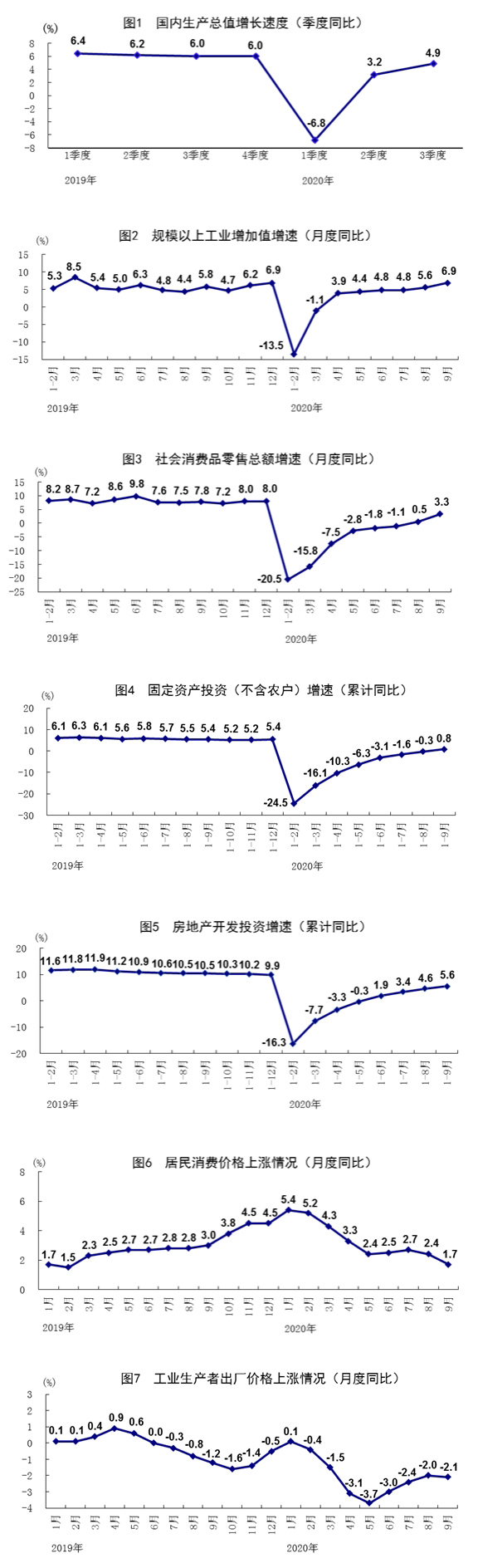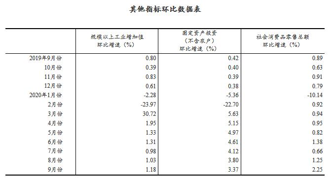 (2)根据季节调整模型自动修正结果,对近一年来各期国内生产总值、规模以上工业增加值、固定资产投资(不含农户)、社会消费品零售总额环比增速进行修订。修订结果及2020年三季度GDP环比数据、2020年9月份其他指标环比数据如下: