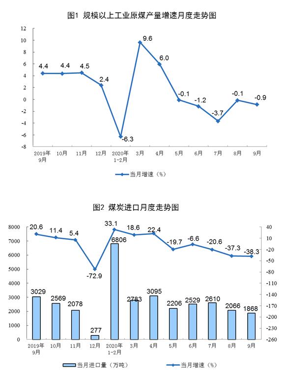 原煤生产降幅略有扩大。9月份,生产原煤3.3亿吨,同比下降0.9%,降幅比上月扩大0.8个百分点;日均产量1104万吨,环比增加53万吨。1—9月份,生产原煤27.9亿吨,同比下降0.1%。
