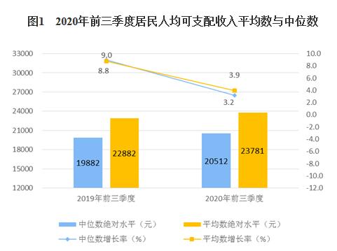 前三季度,全国居民人均可支配收入中位数20512元,增长3.2%,中位数是平均数的86.3%。其中,城镇居民人均可支配收入中位数30015元,增长2.4%,中位数是平均数的91.5%;农村居民人均可支配收入中位数10650元,增长4.7%,中位数是平均数的86.6%。