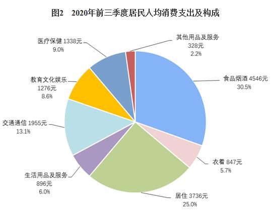 前三季度,全国居民人均食品烟酒消费支出4546元,增长5.5%,占人均消费支出的比重为30.5%;人均衣着消费支出847元,下降11.9%,占人均消费支出的比重为5.7%;人均居住消费支出3736元,增长3.6%,占人均消费支出的比重为25.0%;人均生活用品及服务消费支出896元,下降3.3%,占人均消费支出的比重为6.0%;人均交通通信消费支出1955元,下降5.9%,占人均消费支出的比重为13.1%;人均教育文化娱乐消费支出1276元,下降27.7%,占人均消费支出的比重为8.6%;人均医疗保健消费支出1338元,下降5.4%,占人均消费支出的比重为9.0%;人均其他用品及服务消费支出328元,下降18.1%,占人均消费支出的比重为2.2%。