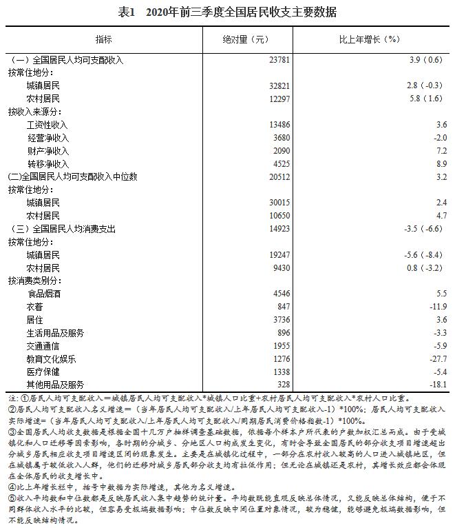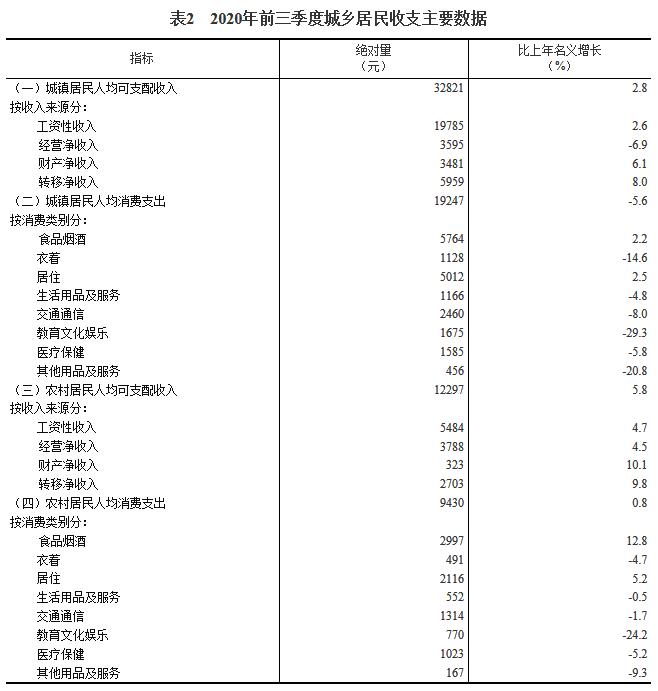 前三季度,全国居民人均可支配收入23781元,比上年同期名义增长3.9%,扣除价格因素,实际增长0.6%。其中,城镇居民人均可支配收入32821元,增长(以下如无特别说明,均为同比名义增速)2.8%,扣除价格因素,实际下降0.3%;农村居民人均可支配收入12297元,增长5.8%,扣除价格因素,实际增长1.6%。