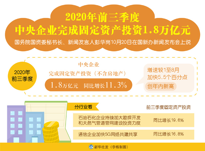图表:2020年前三季度中央企业完成固定资产投资1.8万亿元
