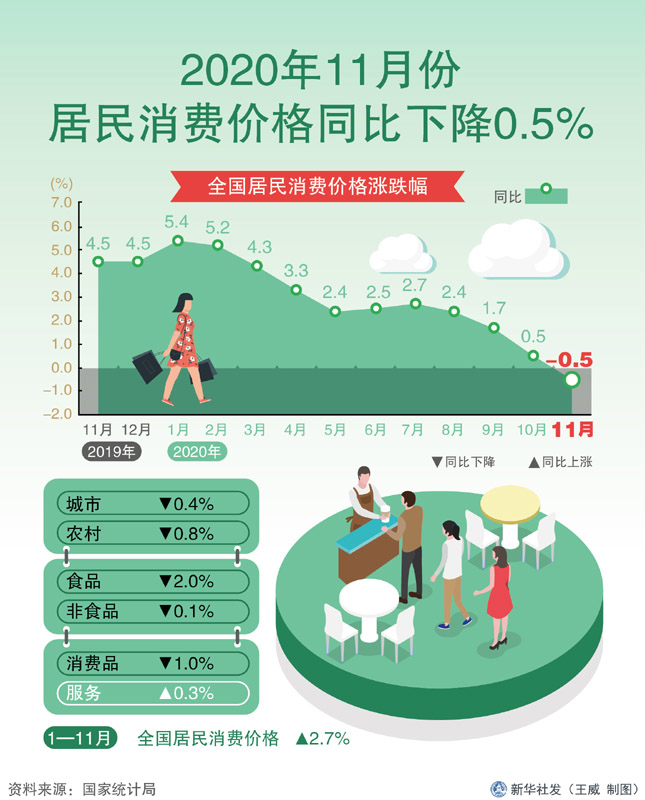 2020年11月份居民消费价格同比下降0.5%
