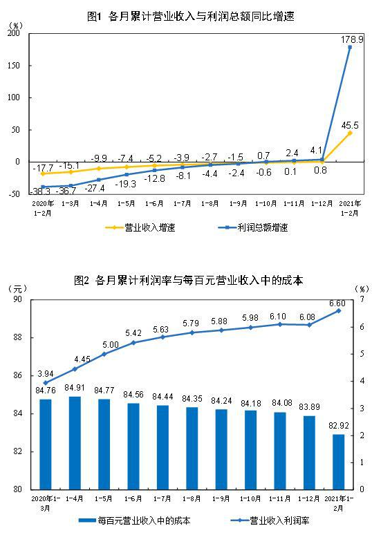 1—2月份,规模以上工业企业实现营业收入16.87万亿元,同比增长45.5%;发生营业成本13.99万亿元,增长43.5%;营业收入利润率为6.60%,同比提高3.15个百分点。
