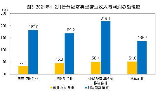 1—2月份,规模以上工业企业中,国有控股企业实现利润总额3752.2亿元,同比增长1.82倍;股份制企业实现利润总额7762.5亿元,增长1.69倍;外商及港澳台商投资企业实现利润总额3145.2亿元,增长2.19倍;私营企业实现利润总额3316.9亿元,增长1.37倍。