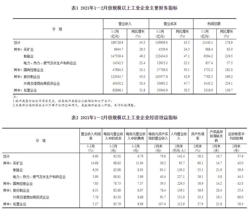 2021年1—2月份全国规模以上工业企业利润同比增长1.79倍 两年平均增长31.2%