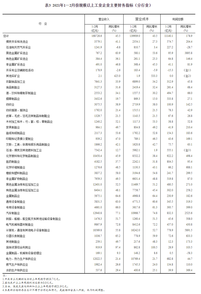1—2月份,全国规模以上工业企业实现利润总额11140.1亿元,同比增长1.79倍(按可比口径计算,详见附注二),比2019年1—2月份增长72.1%,两年平均增长31.2%。