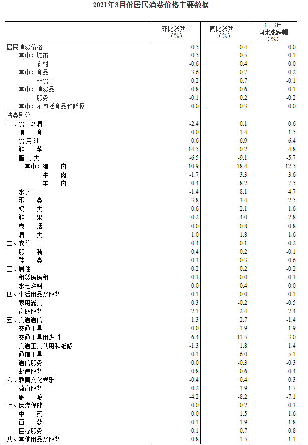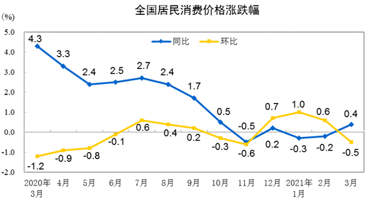 2021年3月份,全国居民消费价格同比上涨0.4%。其中,城市上涨0.5%,农村上涨0.4%;食品价格下降0.7%,非食品价格上涨0.7%;消费品价格上涨0.6%,服务价格上涨0.2%。一季度,全国居民消费价格与去年同期持平。