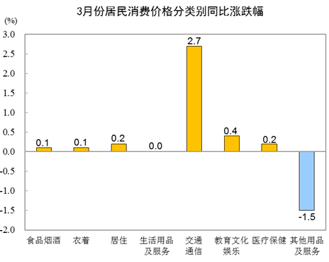 3月份,食品烟酒类价格同比上涨0.1%,影响CPI(居民消费价格指数)上涨约0.03个百分点。食品中,水产品价格上涨8.1%,影响CPI上涨约0.14个百分点;鲜果价格上涨4.0%,影响CPI上涨约0.08个百分点;蛋类价格上涨3.4%,影响CPI上涨约0.02个百分点;粮食价格上涨1.4%,影响CPI上涨约0.02个百分点;畜肉类价格下降9.1%,影响CPI下降约0.40个百分点,其中猪肉价格下降18.4%,影响CPI下降约0.45个百分点。