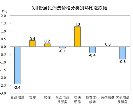 3月份,食品烟酒类价格环比下降2.4%,影响CPI下降约0.71个百分点。食品中,鲜菜价格下降14.5%,影响CPI下降约0.37个百分点;畜肉类价格下降6.5%,影响CPI下降约0.28个百分点,其中猪肉价格下降10.9%,影响CPI下降约0.24个百分点;蛋类价格下降3.8%,影响CPI下降约0.02个百分点;水产品价格下降1.4%,影响CPI下降约0.03个百分点。