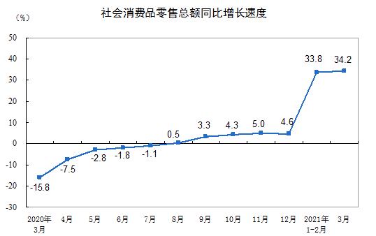 2021年3月份社会消费品零售总额增长34.2% 比2019年3月份增长12.9%