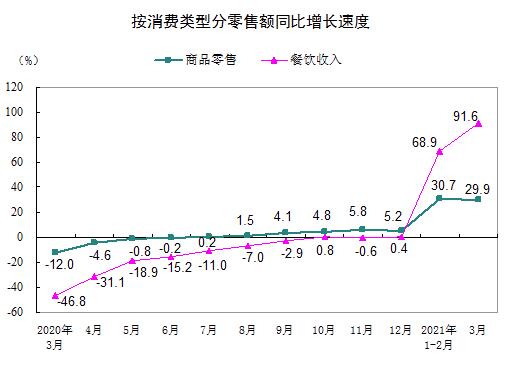 按消费类型分,3月份,商品零售31974亿元,同比增长29.9%,两年平均增长6.9%;餐饮收入3511亿元,增长91.6%,两年平均增长0.9%。1—3月份,商品零售94625亿元,同比增长30.4%,两年平均增长4.8%;餐饮收入10596亿元,增长75.8%,两年平均下降1.0%。