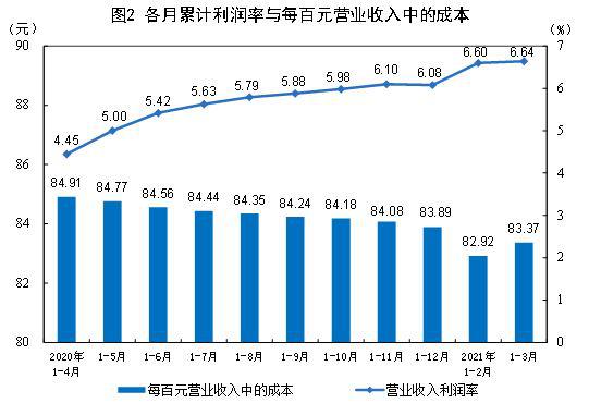 1—3月份,规模以上工业企业实现营业收入27.48万亿元,同比增长38.7%;发生营业成本22.91万亿元,增长36.5%;营业收入利润率为6.64%,同比提高2.76个百分点。