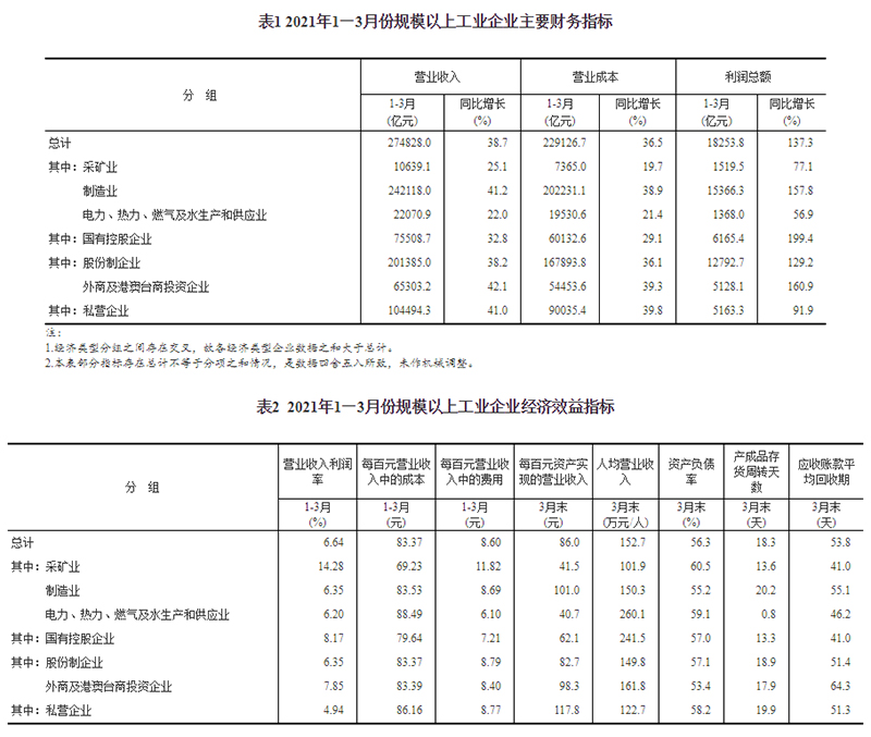 2021年1—3月份全国规模以上工业企业利润同比增长1.37倍 两年平均增长22.6%