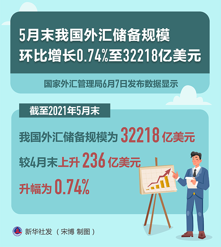 图表:5月末我国外汇储备规模环比增长0.74%至32218亿美元