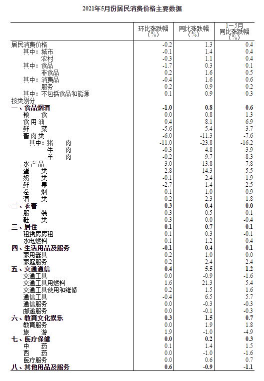 2021年5月份居民消费价格同比上涨1.3% 环比下降0.2%