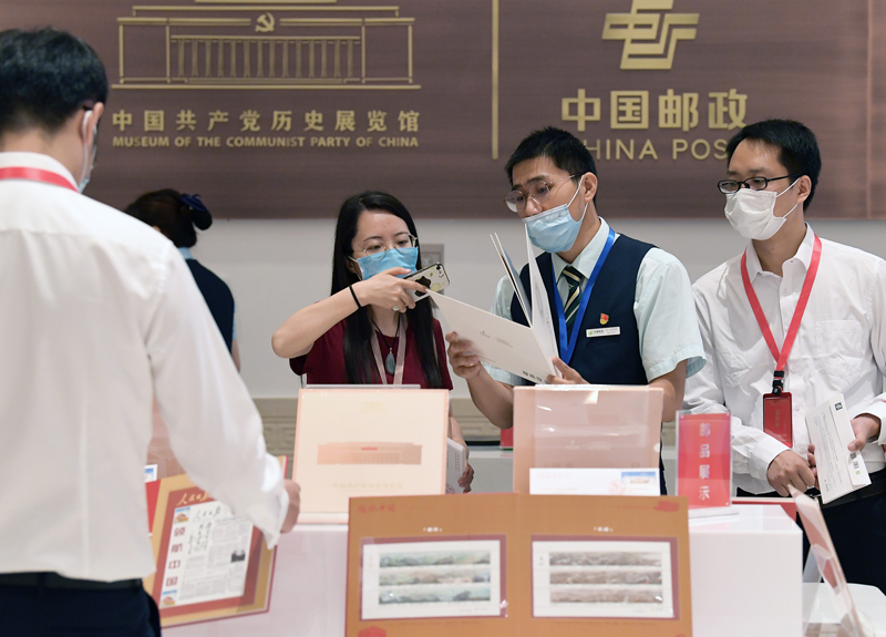 6月20日,一位工作人员在中国共产党历史展览馆主题邮局展示《中国共产党历史展览馆》特种邮票首日封。新华社记者 李贺 摄