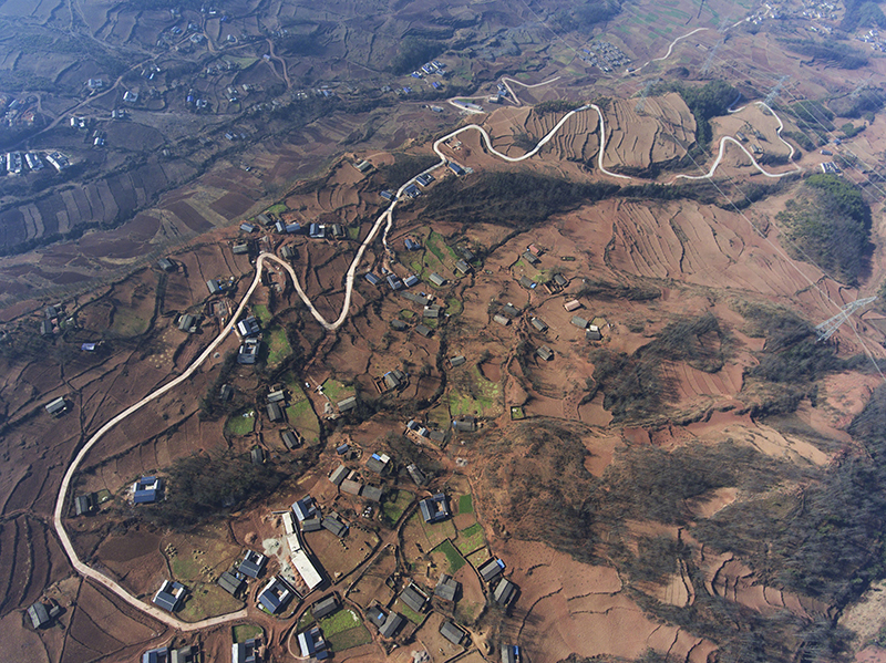 这是四川省凉山彝族自治州美姑县四峨吉村约6公里的道路硬化项目(2017年2月12日摄,无人机照片)。2015年8月,蒋富安由凉山州审计局派到美姑县九口乡四峨吉村任驻村第一书记,2016年8月22日因劳累猝死,年仅26岁。新华社记者 刘坤 摄
