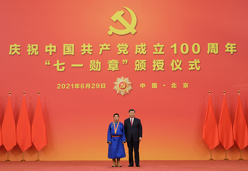 6月29日,庆祝中国共产党成立100周年“七一勋章”颁授仪式在北京人民大会堂金色大厅隆重举行。中共中央总书记、国家主席、中央军委主席习近平向“七一勋章”获得者廷·巴特尔颁授勋章。新华社记者 李学仁 摄