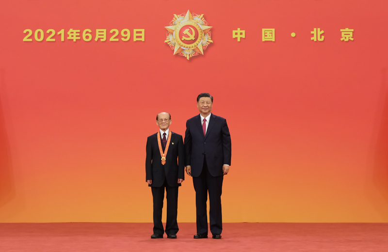 6月29日,庆祝中国共产党成立100周年“七一勋章”颁授仪式在北京人民大会堂金色大厅隆重举行。中共中央总书记、国家主席、中央军委主席习近平向“七一勋章”获得者崔道植颁授勋章。新华社记者 李学仁 摄