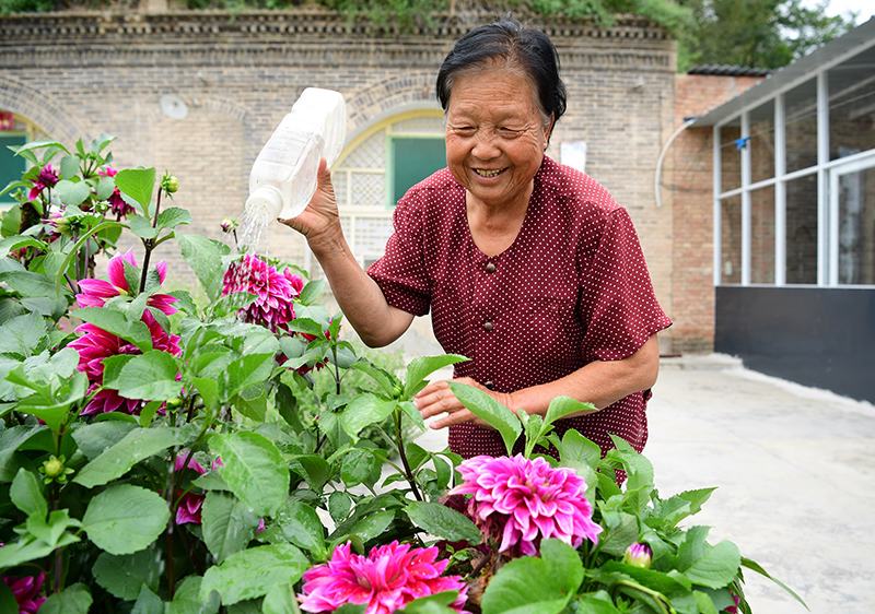 侯秀珍在位于延安市宝塔区南泥湾村的家中浇花(2017年9月14日摄)。新华社记者 邵瑞 摄