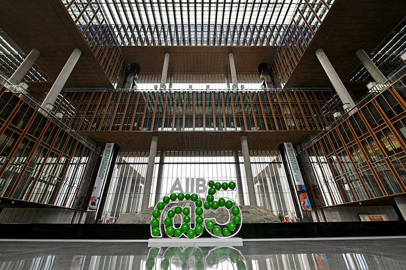 这是亚投行总部大楼内景和庆祝正式开业五周年装饰(2021年1月13日摄)。新华社记者 李鑫 摄