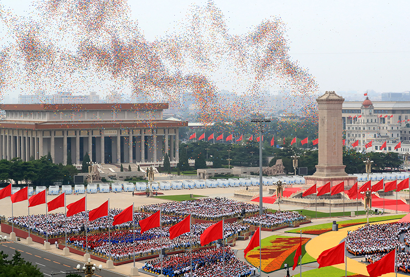 7月1日上午,庆祝中国共产党成立100周年大会在北京天安门广场隆重举行。这是庆祝大会现场彩色气球腾空而起。