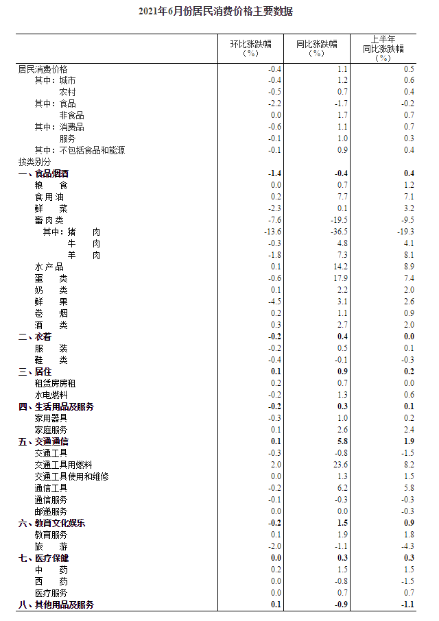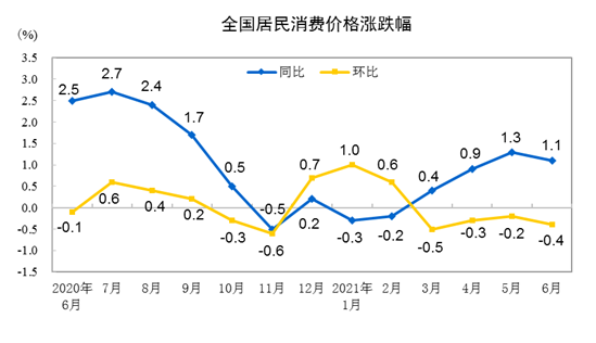 2021年6月份居民消费价格同比上涨1.1% 环比下降0.4%