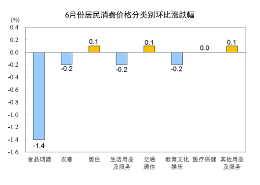 6月份,全国居民消费价格环比下降0.4%。其中,城市下降0.4%,农村下降0.5%;食品价格下降2.2%,非食品价格持平;消费品价格下降0.6%,服务价格下降0.1%。