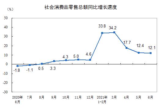 2021年6月份社会消费品零售总额增长12.1% 比2019年6月份增长10.0%