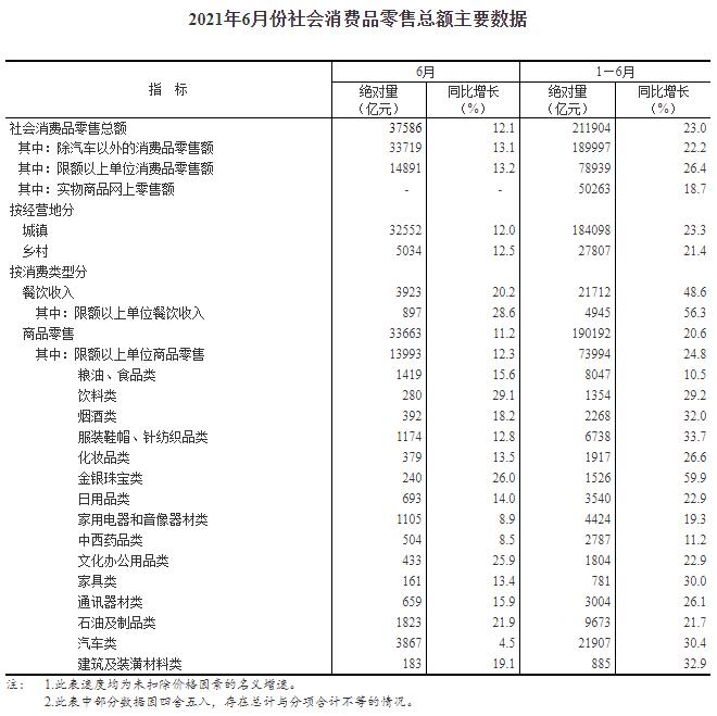 按经营单位所在地分,6月份,城镇消费品零售额32552亿元,同比增长12.0%,两年平均增长4.8%;乡村消费品零售额5034亿元,增长12.5%,两年平均增长5.5%。1—6月份,城镇消费品零售额184098亿元,同比增长23.3%,两年平均增长4.4%;乡村消费品零售额27807亿元,增长21.4%,两年平均增长4.0%。