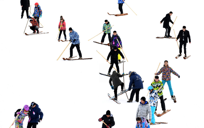 这是人们在阿勒泰市将军山滑雪场参加毛皮滑雪庆祝活动(2019年1月16日摄)。新华社记者 沙达提 摄