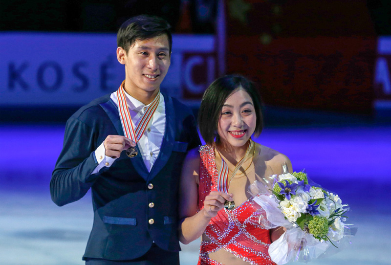 2017年3月30日,隋文静(右)/韩聪在芬兰赫尔辛基举行的2017年花样滑冰世锦赛双人滑比赛颁奖仪式上。新华社发(马蒂凯宁 摄)