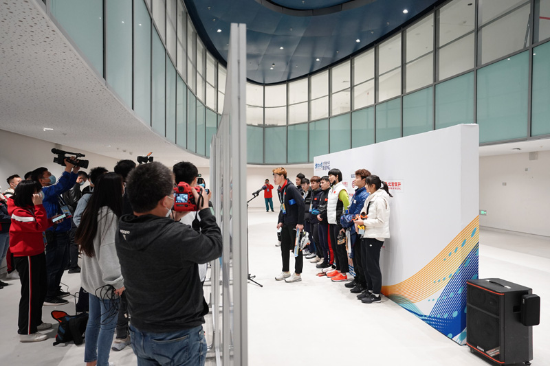 2021年4月7日,在国家速滑馆“冰丝带”,参加“相约北京”冰上测试活动的速度滑冰运动员在混合采访区接受采访。新华社记者 鞠焕宗 摄