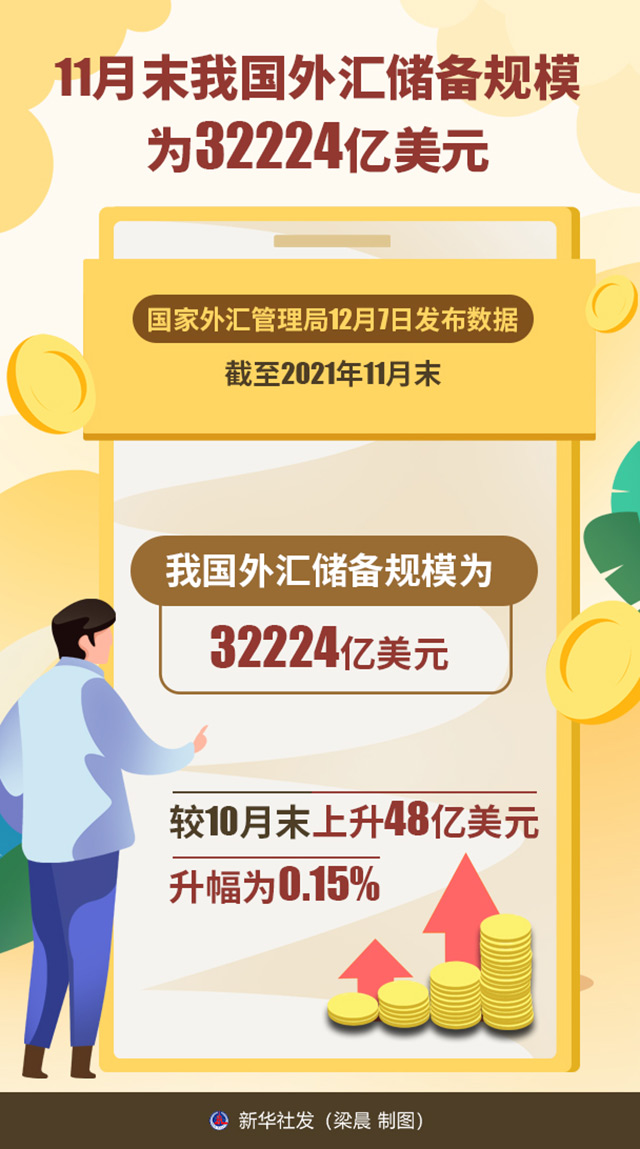 国家外汇管理局12月7日发布数据显示,截至2021年11月末,我国外汇储备规模为32224亿美元,较10月末上升48亿美元,升幅为0.15%。