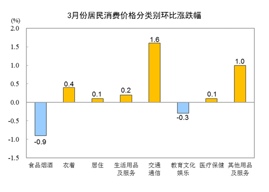 3月份,全国居民消费价格环比持平。其中,城市持平,农村持平;食品价格下降1.2%,非食品价格上涨0.3%;消费品价格上涨0.2%,服务价格下降0.2%。