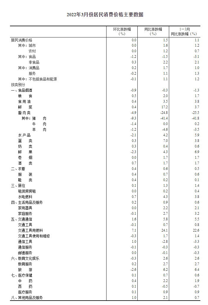 2022年3月份居民消费价格同比上涨1.5% 环比持平