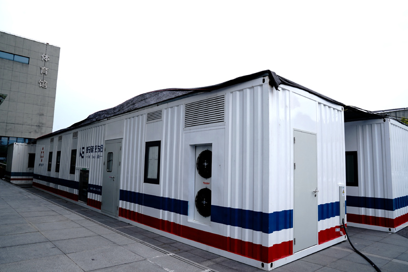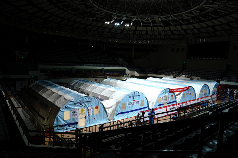 4月15日在上海市浦东新区曹路体育中心拍摄的核子华曦核酸检测方舱实验室。