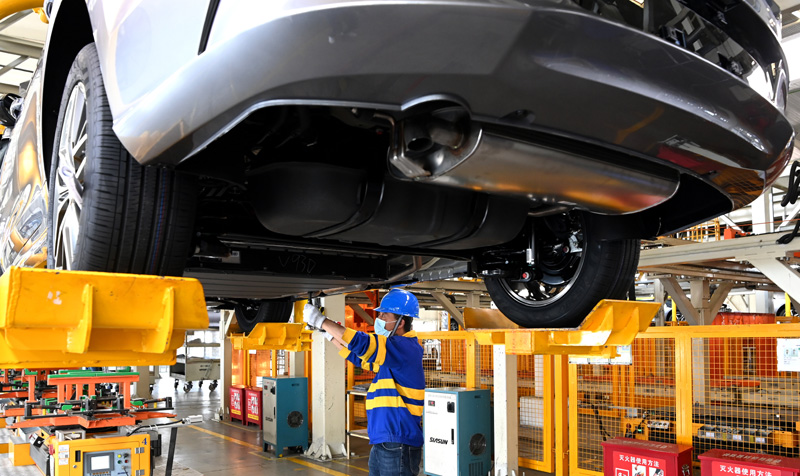 工作人员在西安比亚迪草堂工业园汽车总装厂进行新能源汽车装配(2022年4月20日摄)。新华社记者 刘潇 摄