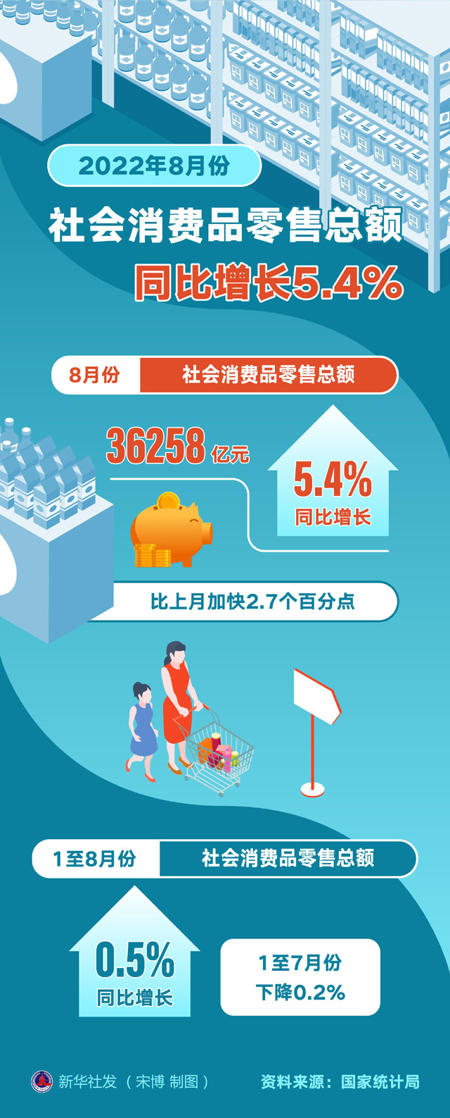 图表:2022年8月份社会消费品零售总额同比增长5.4%