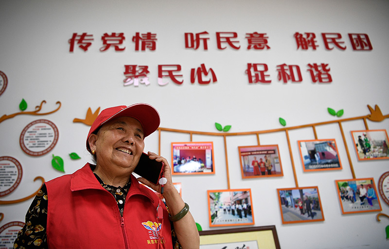 宁夏吴忠市利通区金花园社区党员王兰花在社区工作站与居民通电话(2021年6月16日摄)。新华社记者 王鹏 摄