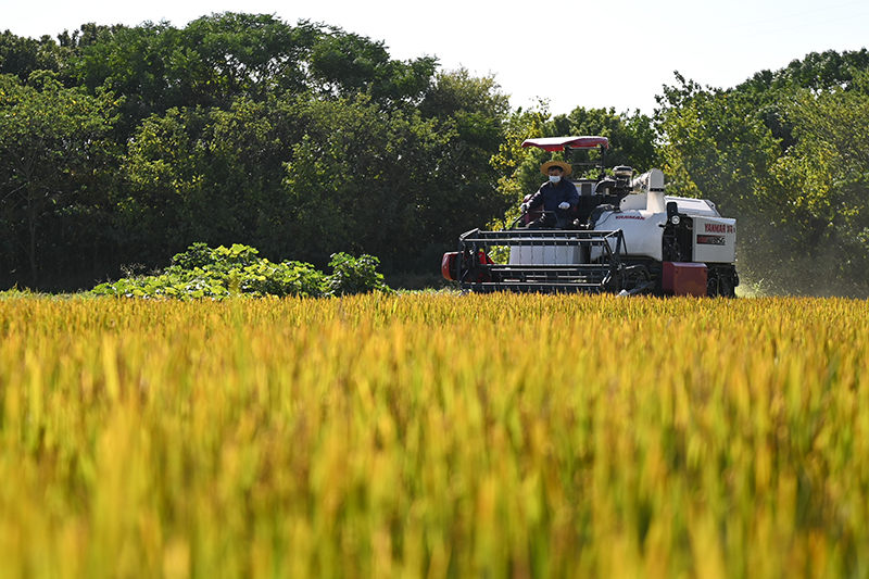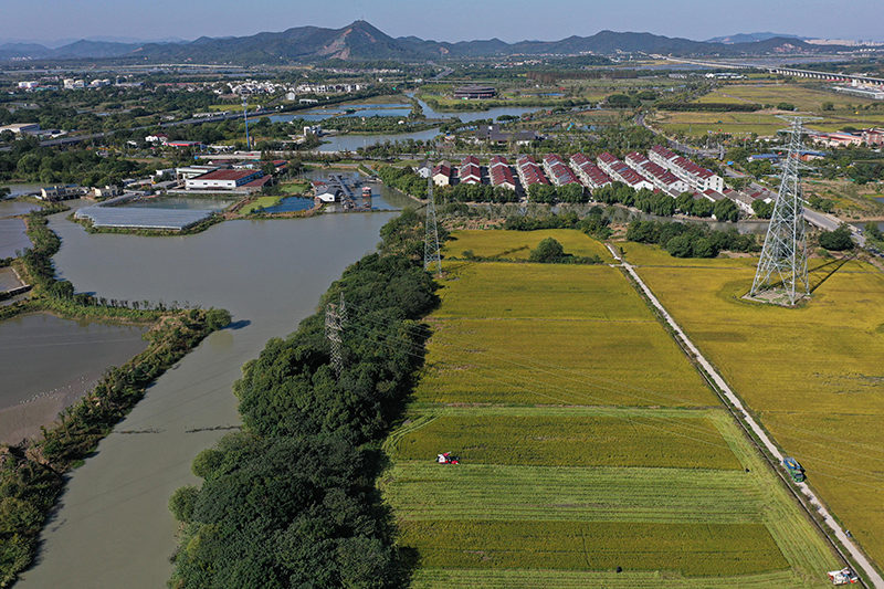 近日,浙江省湖州市吴兴区八里店镇种植的水稻迎来收获季节,农户操作收割机在稻田里作业,呈现一幅幅美丽的丰收图景。