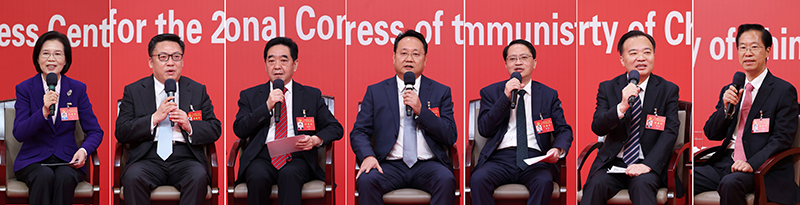 10月18日,中国共产党第二十次全国代表大会新闻中心举行集体采访。黑龙江、上海、江苏、浙江、安徽、福建、江西代表团新闻发言人出席,介绍代表团学习讨论二十大报告情况,并回答记者提问(拼版照片)。