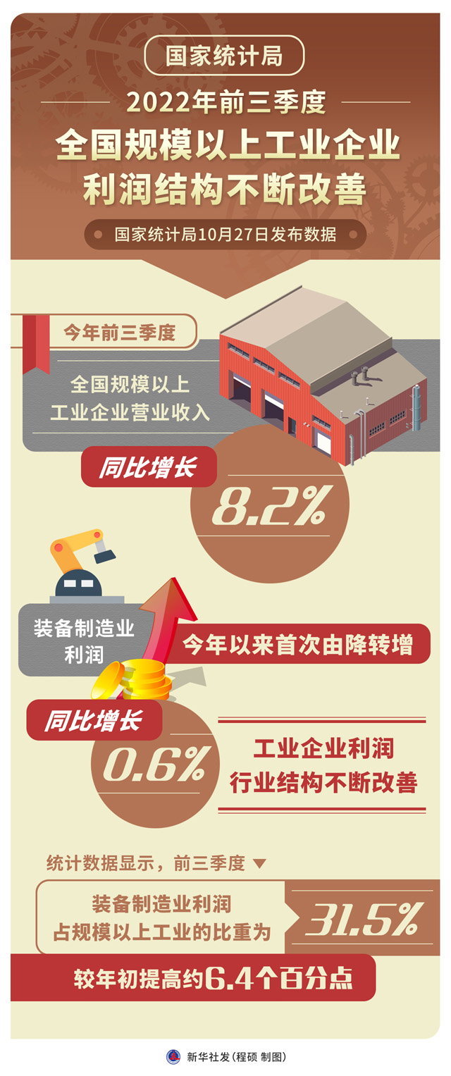 国家统计局10月27日发布数据,今年前三季度,全国规模以上工业企业营业收入同比增长8.2%,企业利润同比下降2.3%,但装备制造业利润今年以来首次由降转增,同比增长0.6%,工业企业利润行业结构不断改善。