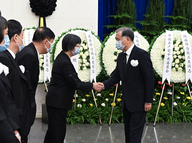 上午9时许,汪洋等在哀乐声中缓步来到钱正英同志的遗体前肃立默哀,向钱正英同志的遗体三鞠躬,并向钱正英同志亲属转达习近平总书记等中央领导同志的深切慰问。
