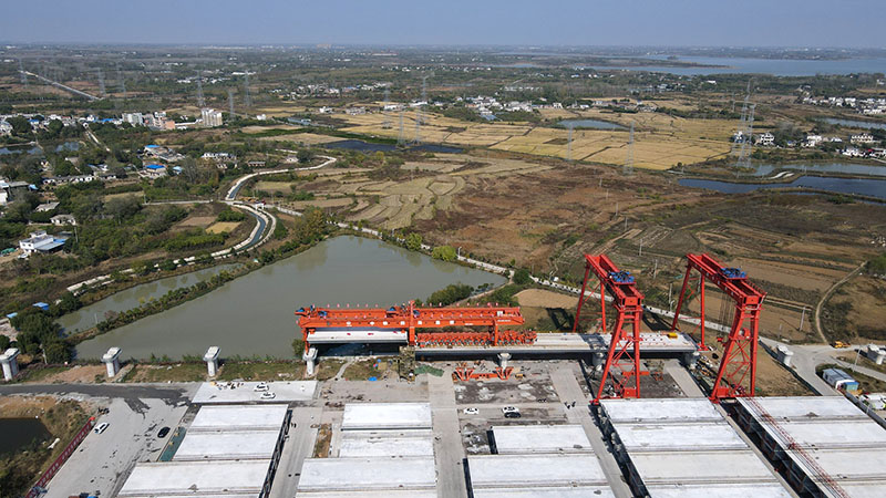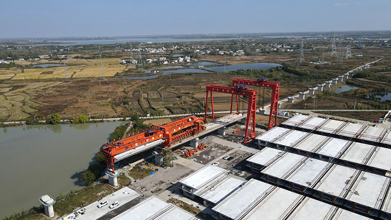 这是中铁四局合新铁路安徽段站前七标箱梁架设现场(10月30日摄,无人机照片)。