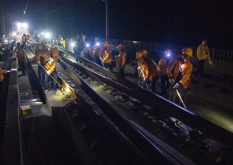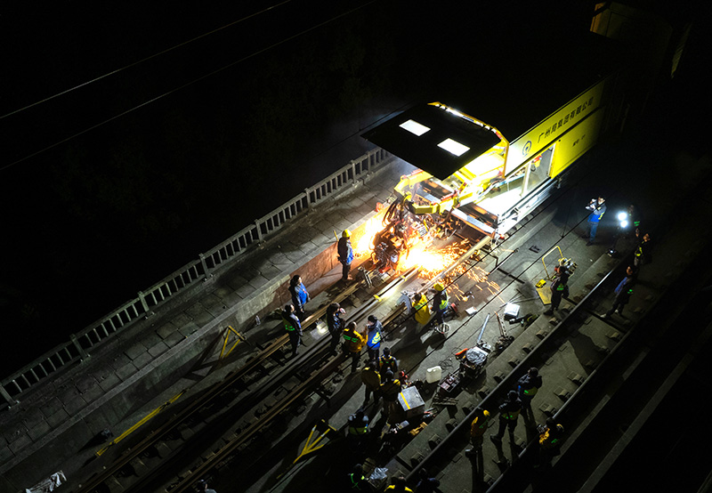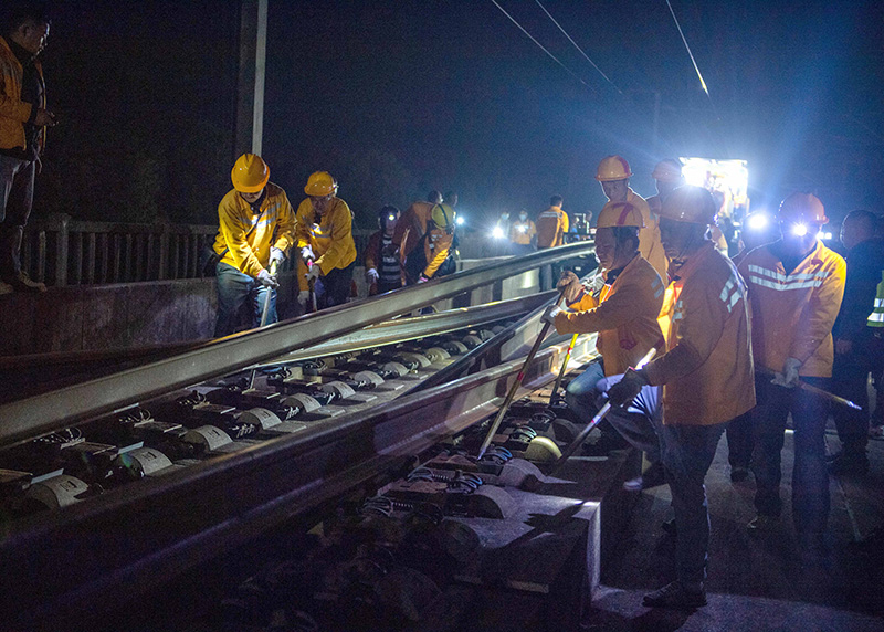 11月2日凌晨,铁路工人在京广高铁株洲西至衡山西区间进行换轨施工。