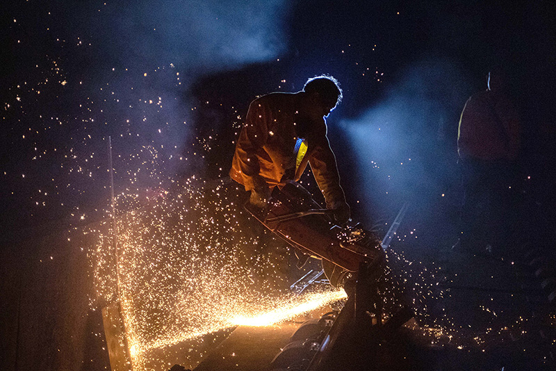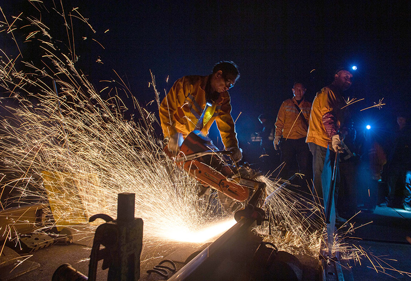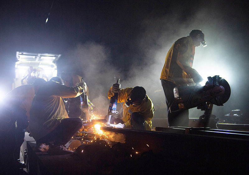 11月2日凌晨,在京广高铁株洲西至衡山西区间,铁路工人在锯轨。